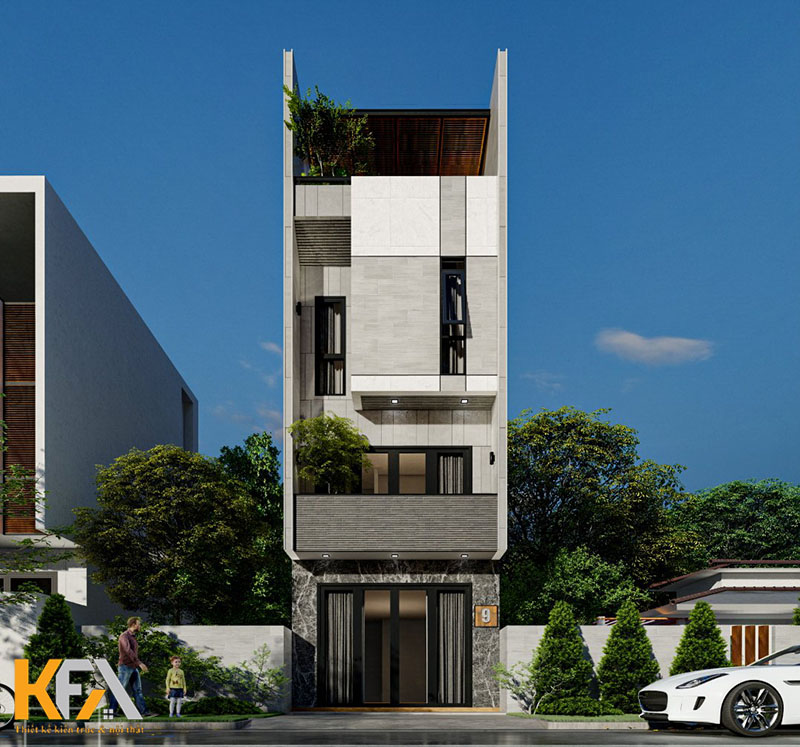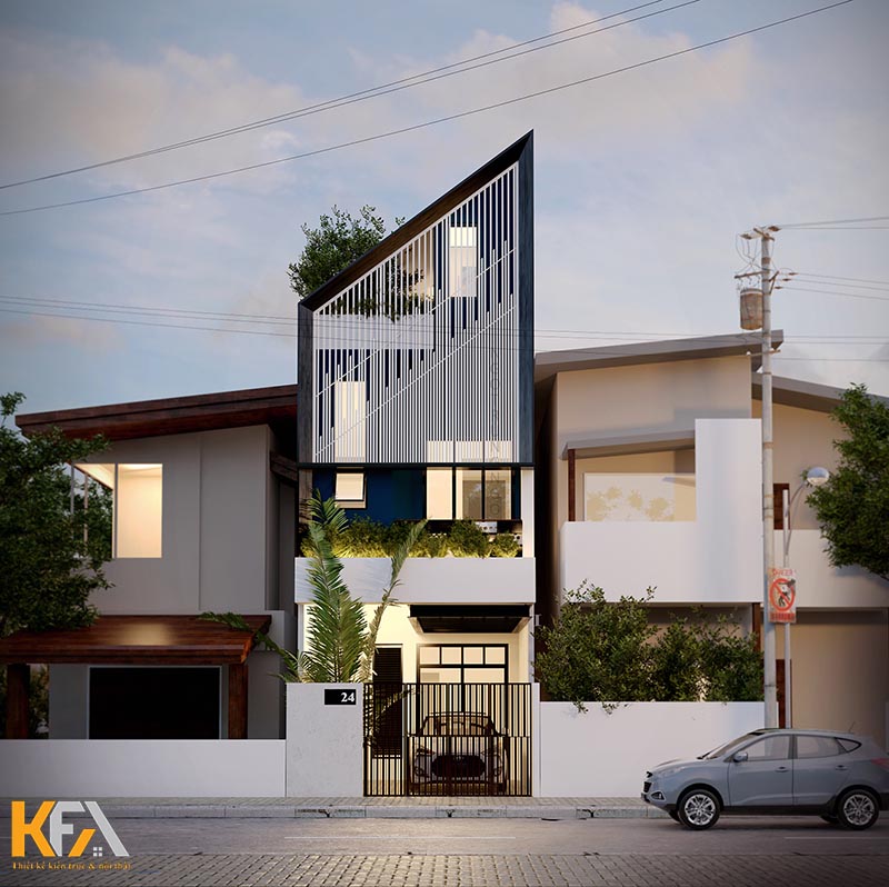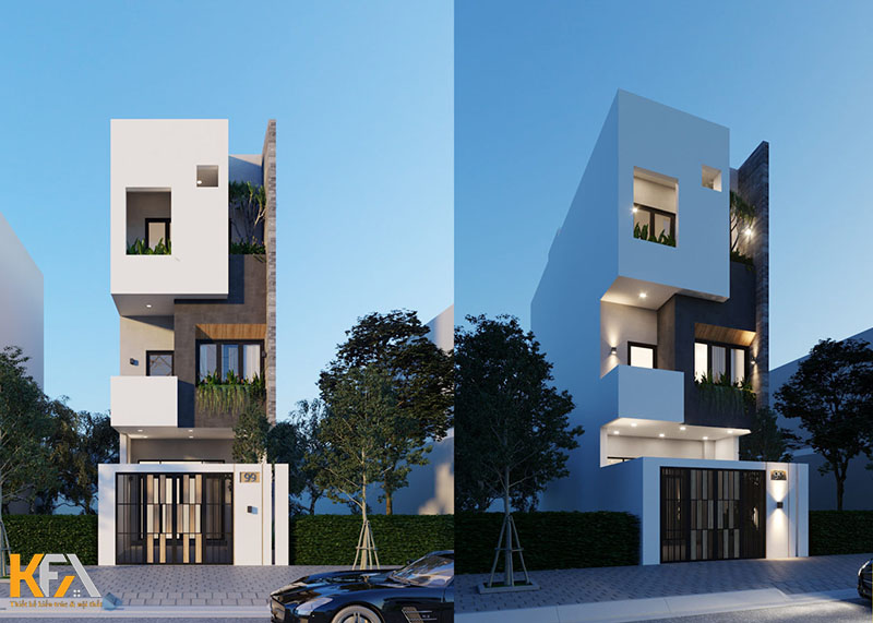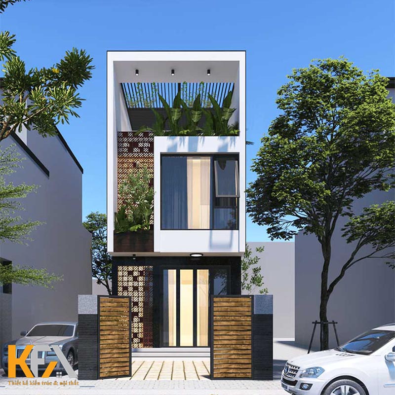 Mẫu thiết kế nhà ống diện tích 3x25m với không gian trang trí mặt tiền trẻ trung nổi bật dưới đây là một trong những mẫu thiết kế được rất nhiều khách hàng yêu thích. Mẫu thiết kế tận dụng chiều sâu lớn, KTS đã bố trí một khoảng sân nhỏ trước nhà vừa làm khu vực để xe vừa giúp ngôi nhà thông thoáng, mát mẻ hơn. Thiết kế mặt tiền với những đường nét trang trí hình học thể hiện nét cá tính, trẻ trung của chủ nhân ngôi nhà. Mẫu thiết kế còn khéo léo sử dụng 2 tone màu trắng xám đối lập mang đến một không gian ngoại thất, thu hút mọi ánh nhìn.