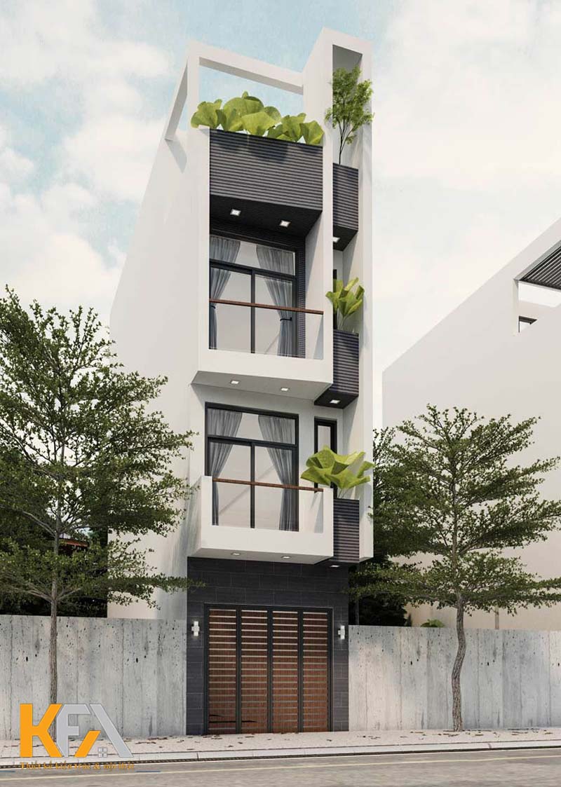 Mẫu thiết kế căn nhà ống mặt tiền 3m thiết kế với không gian hiện đại, mặt tiền trang lan can sắt nghệ thuật độc đáo. Ngôi nhà được gia chủ thiết kế với 4 tầng lầu, tầng trên cùng là sân thượng thiết kế mặt tiền giả mái cùng không gian sân phơi phí sau, giup gia chủ có được không gian sinh hoạt tiện nghi, đầy đủ nhất. Ngôi nhà còn được trang trí với tone trắng nổi bật trên đó là bố trí không gian mặt tiền cây xang tươi mát, thoải mái