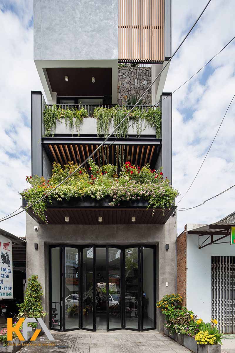 Một thiết kế nhà ống mặt tiền 3m với tầng lửng giúp mở rộng không gian sinh hoạt cho cả gia đình nhưng vẫn giúp tiết kiệm chi phí. Ngôi nhà ống hiện đại dưới đây được thiết kế với không gian mặt tiền hiện đại cùng cây xanh bao quanh ban công xanh mát và thoải mái. Mẫu thiết kế với tầng lửng đơn giản, cùng cách bố trí nội thất khoa học thu hút sự chú ý của mọi người. Ngôi nhà được thiết kế với mặt tiền độc đáo, trang trí với tone màu xánh lạnh cùng đá ốp lát mặt tiền cá tính. Không gian mặt tiền thể hiện nét đẹp hiện đại, trẻ trung, vô cùng cuốn hút của ngôi nhà.
