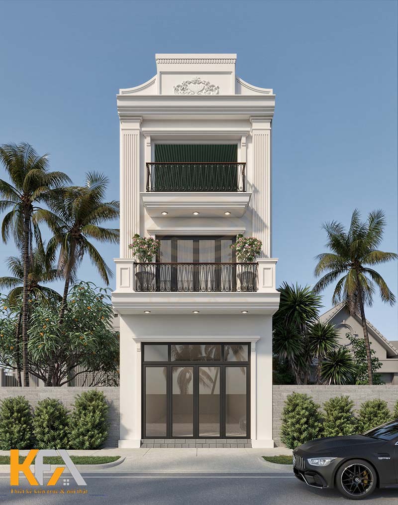 Mẫu thiết kế nhà ống 4 tầng mặt tiền 3m phong cách tân cổ điển thể hiện rõ nét đẹp sang trọng, cá tính của kiến trúc ngôi nhà. Mặc dù mặt tiền ngôi nhà có phần hẹp nhưng dưới bàn tay khéo léo cùng kinh nghiệm thi công dày dặn, ngôi nhà hiện lên với vẻ đẹp đọc đáo từ máu thái, trụ cột tròn đến ban công mặt tiền nổi bật.